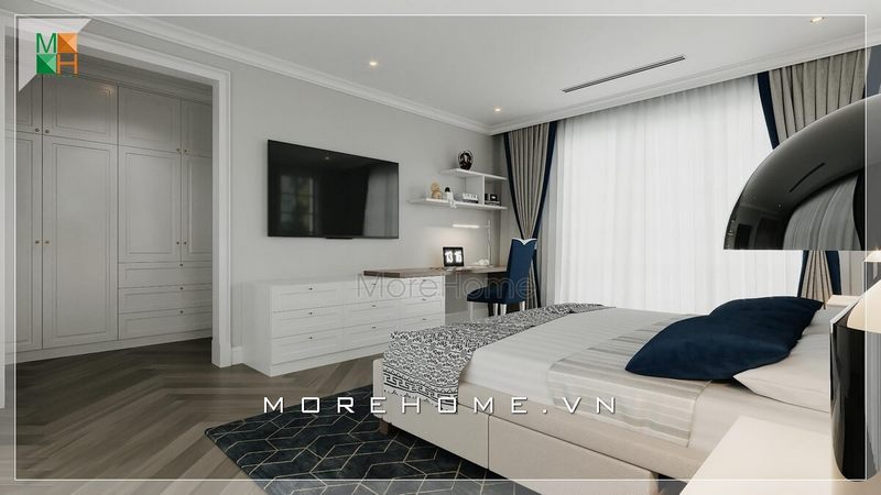Bàn gỗ tân cổ điển kết hợp vách ngăn trang trí mạ vàng tạo nên không gian sang trọng, đẳng cấp cho phòng ngủ master cao cấp.
