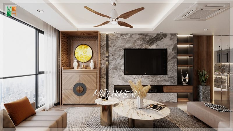 Bàn trà đôi mặt đá được đặt ở vị trí trung tâm mang đến sự sang trọng, lịch sự cho không gian tổ ấm của gia đình Việt.