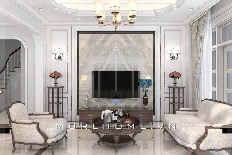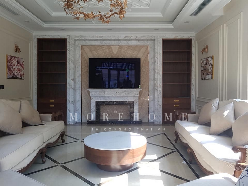 Giới thiệu mẫu thi công thiết kế phòng khách gỗ óc chó biệt thự, nhà phố, chung cư cao cấp tân cổ điển sang trọng.