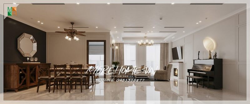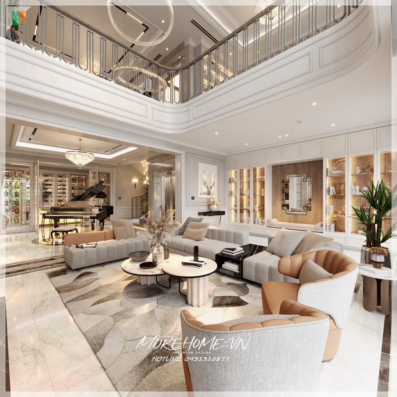 Nhà của bạn được thiết kế với những chi tiết tinh tế và đặc trưng của phong cách tân cổ điển, từ đường chỉ phào đến bộ bàn ghế sofa phòng khách. Chân ghế gỗ tự nhiên uốn lượn mềm mại, tạo nên một không gian sang trọng và tinh tế.