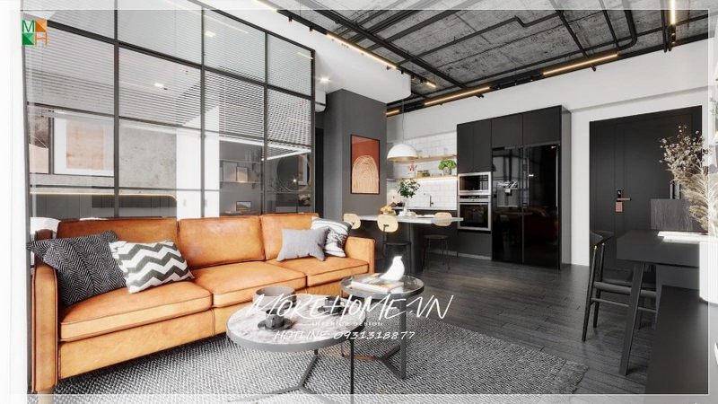Nổi bật lên trên hết đó là chiếc ghế sofa phòng khách chung cư được bọc da màu nâu vàng sang trọng hiện đại.