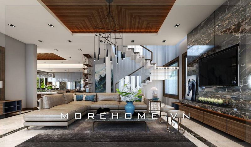 Một mẫu thiết kế phòng khách sang trọng và đẳng cấp cho biệt thự được tạo ra bởi sự kết hợp hài hòa giữa các màu nội thất độc đáo, tạo nên một không gian thu hút.